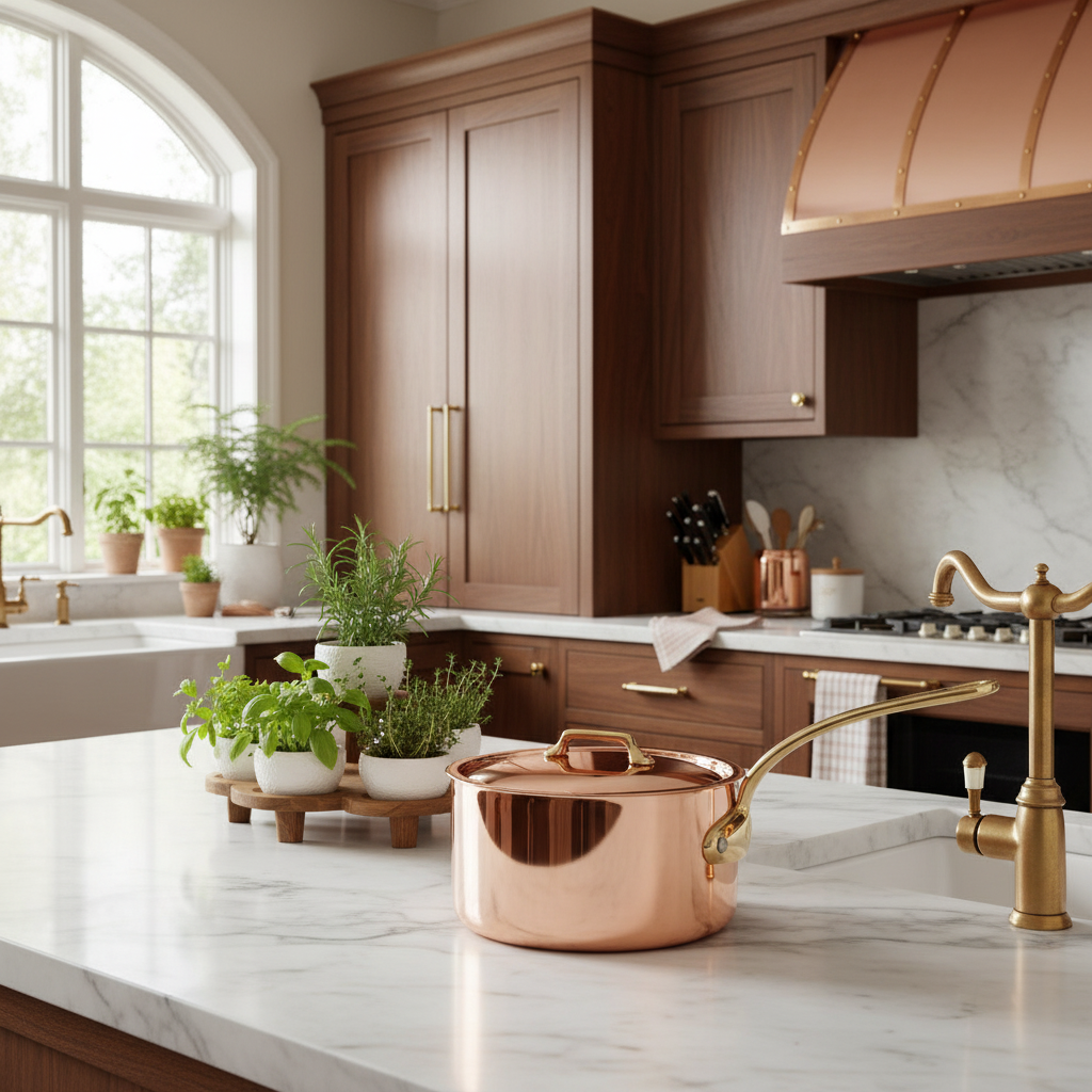 • Brass Handles. Are traditional and substantial. Offer a very comfortable grip and good balance. Pouring rims on every piece