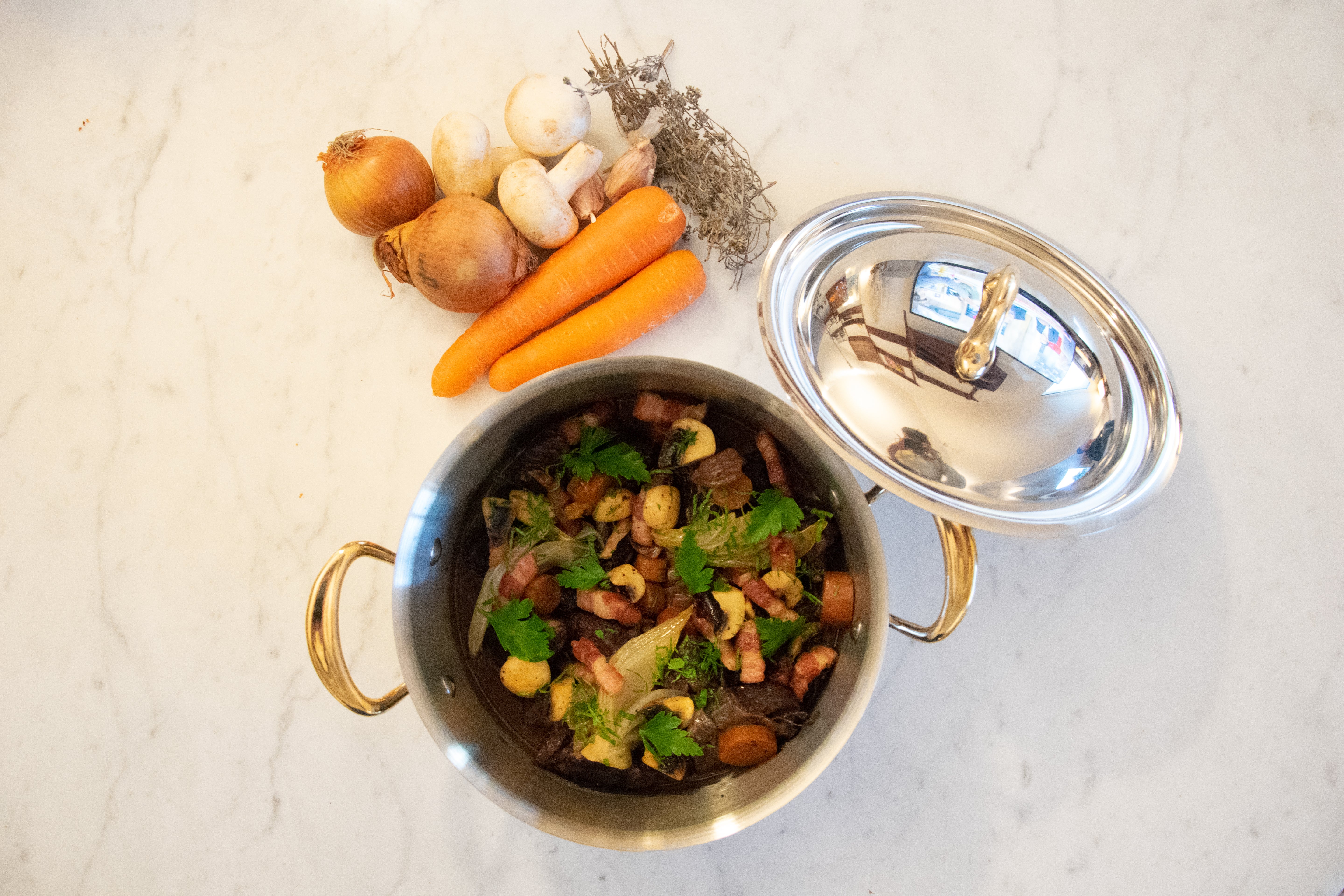 7-Add the reserved red wine, veal stock, and about 1 ¼ cups (30 cl) of water. Bring to a boil, then reduce heat to low and simmer gently for 3–4 hours, covered.