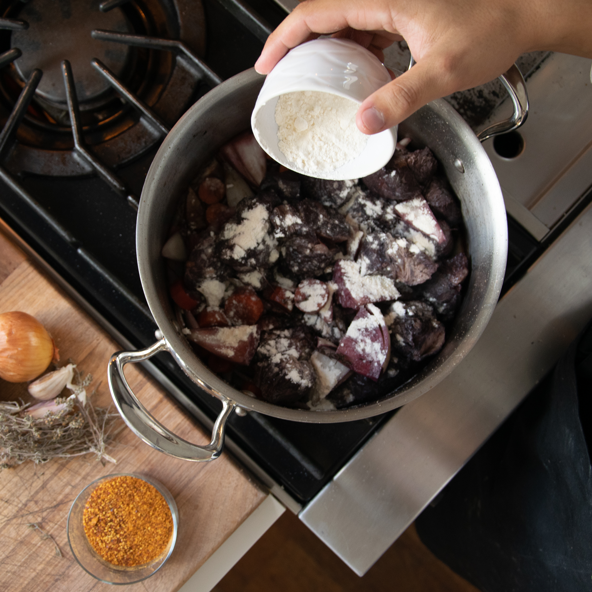 6-Once all pieces are seared, add the aromatic vegetables back into the pot. Let cook for a few minutes, then sprinkle in the flour. Stir and cook for a few more minutes to coat and slightly toast the flour.