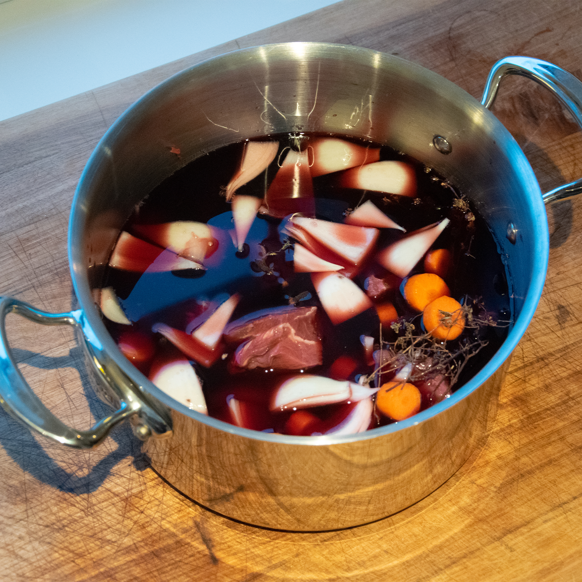 3-Marinate the beef with the aromatic garnish in the red wine overnight in the refrigerator.