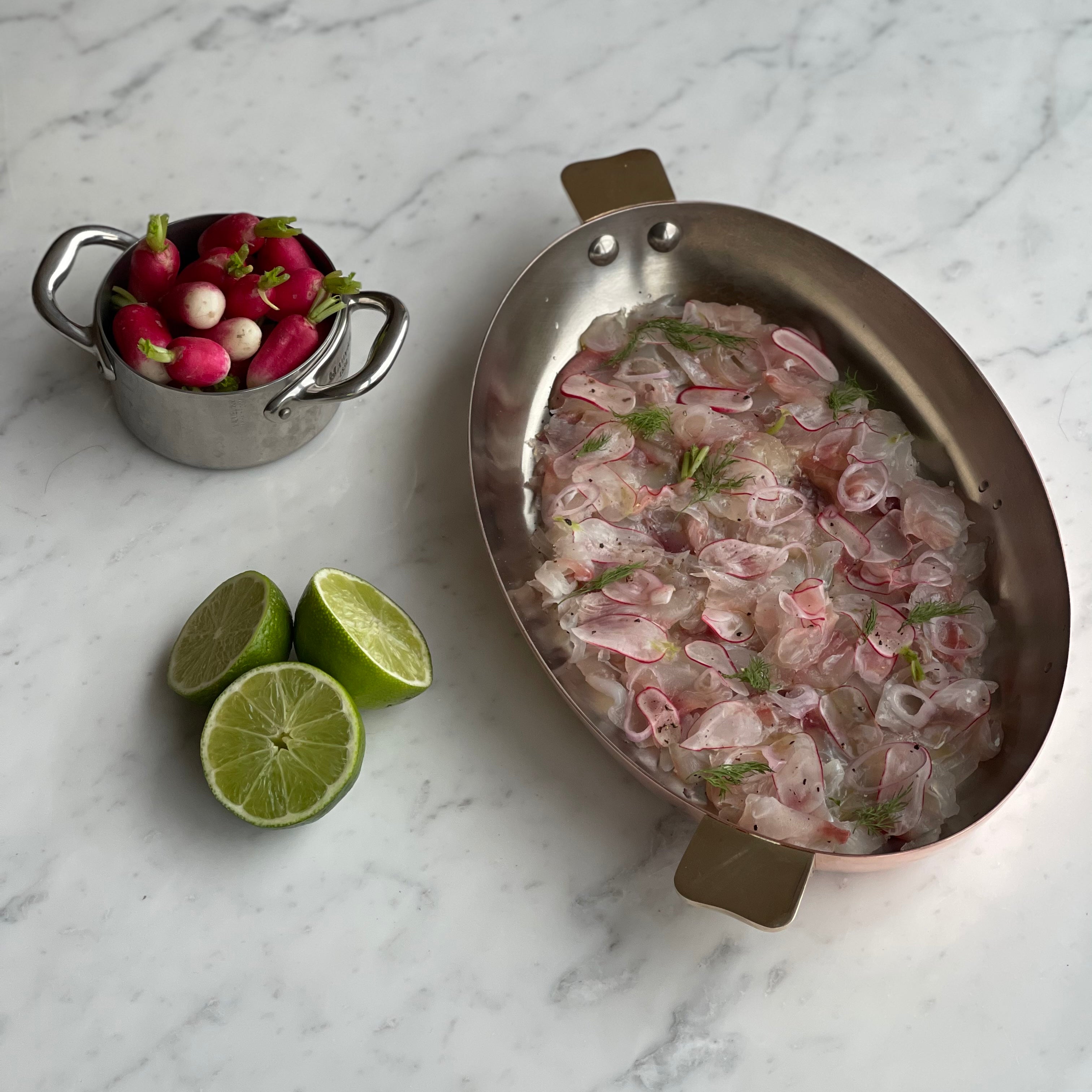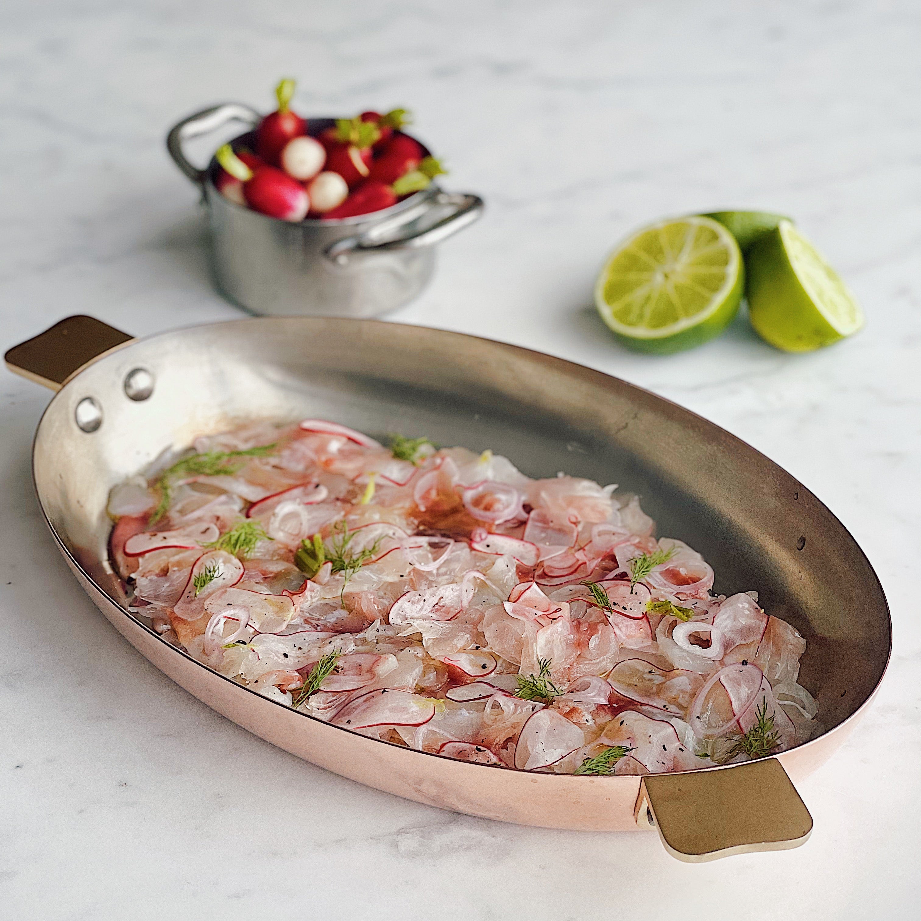 Arrange the thin slices of sea bream flat on an oval dish, drizzle with olive oil, then top with the vegetables and a few fresh herbs of your choice.
